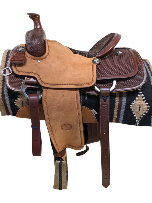 This saddle is the perfect combination of functionality and beauty. The saddle features a reddish-brown leather tooled with basket stamp. The rough-out seat jockey and fenders provide the perfect grip alongside the suede, bicycle style padded seat. The chocolate seat is accented by quilted stitching. Comes with a rear cinch.