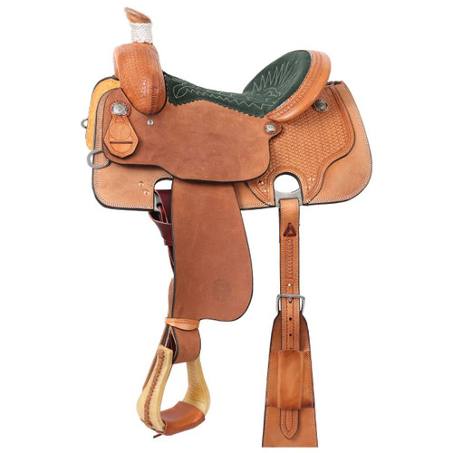 - Key Features: Secure seat for the rider of any discipline, baby powder holder on the billet for breakaway ropers, in-skirt rigging to eliminate bulk and extra weight, matching rear flank cinch, beautiful hand-tooling