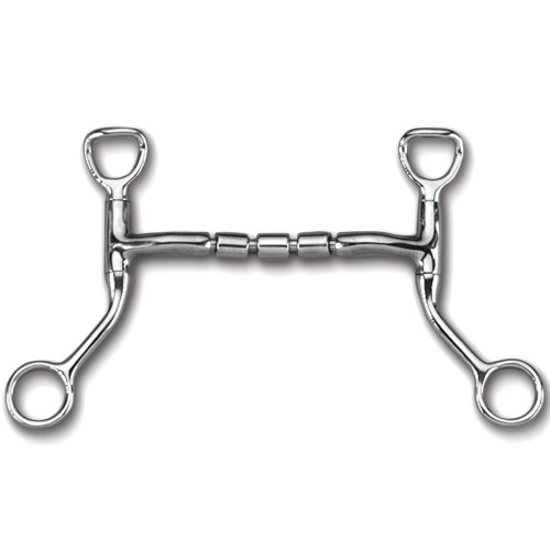 Myler Stainless Steel 5" HBT Shank, MB 32-3 Mullen Triple Barrel, Level 2 The MB 32-3 is an innovative Myler alternative to the traditional mullen. It has three barrels, which turn the mouthpiece from the typical solid bar of a mullen into a flexible bar, which allows the horse to elevate his tongue and swallow more easily. When the reins are engaged, the mouthpiece becomes a solid bar like a traditional mullen, but with an exaggerated curve. This curved bar rotates across the bars and lips down onto the tongue, applying pressure across the entire surface of the tongue. The flexibility of the MB 32-3 makes it very forgiving and comforting when relaxed but offers the rider control when engaged. Sweet iron mouthpiece oxidizes and encourages salivation.