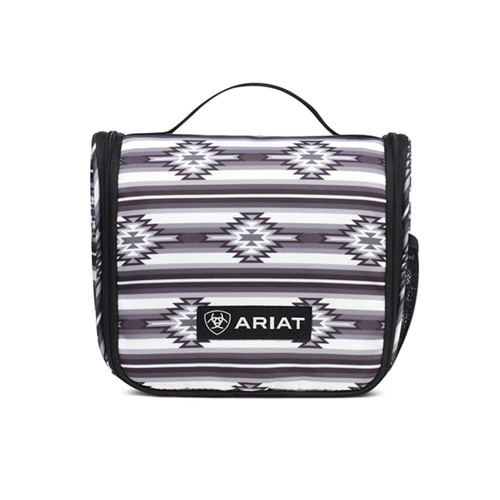 Beautiful Ariat white, grey and black Aztec printed cosmetic bag. It has a hook for you to hang and let the bag cascade down. There is one clear pocket on the inside with a zipper closure, as well as another zipper pocket.
