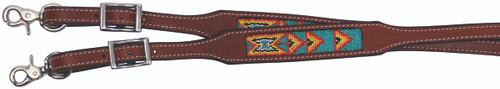 Description Buffalo Leather Leather roping rein Chestnut leather Length: 8' Thickness: 5/8" Trigger snap bit attachment style Turquoise Aztec beading design