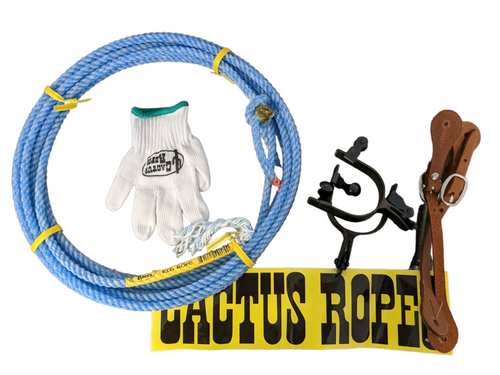 The Cactus Kid Rope Bag is loaded with a kid's cotton glove, a Cactus Ropes bumper sticker, and a Pee Wee rope. It's perfect for the little buckaroos in your herd