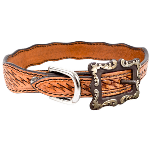For the best friend that deserves something extra special. This collar has basket weave tooling and unique buckles to suit your pet’s personality.
