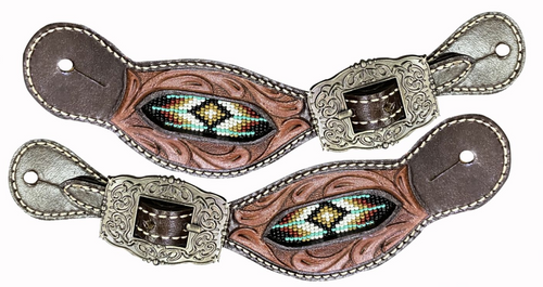 Showman ® Beaded Ladies Spur Straps with antique silver concho's. These spur straps feature medium tooled leather with a beaded southwest inlay and large antique silver concho's.
