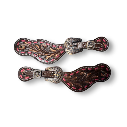 Showman Buck Stitch Spur Straps With Brushed Copper Buckles. These spur straps feature brushed leather accented with metallic copper painted accents and colored buck stitch. Floral engraved brushed copper buckles allows these to adjust 6" to 8".