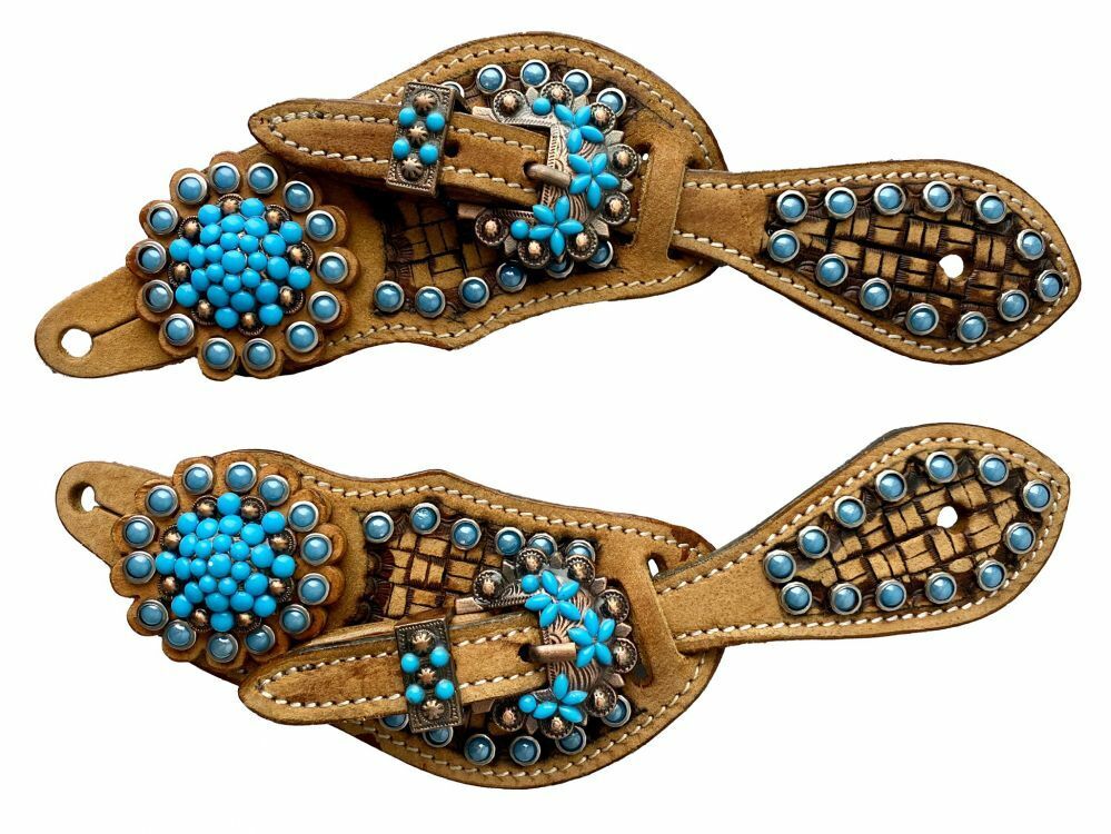 - Made from quality leather, these spur straps feature a classic basket weave tooling design accented with eye-catching turquoise beading and a matching turquoise stone concho.